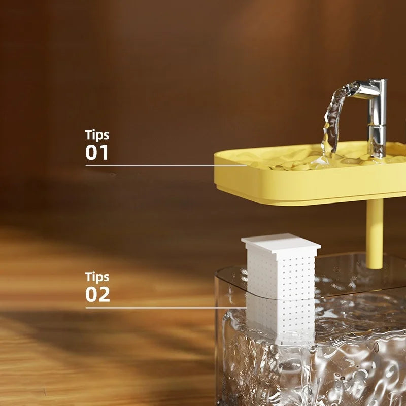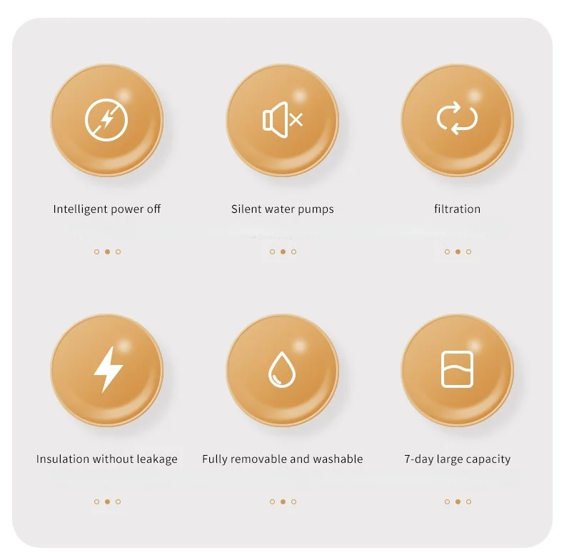 Aerobic active water Stay away from urinary stones Simulate more natural water flow activities, reducing the amount of flowing water Bacteria and magazine troubles, drink with peace of mind Automatic cyclic filtering Multiple purification of water quality Every drop of water that pets drink undergoes multiple filters Effectively soften water quality, improve water quality with peace of mind Filter at the water tray Block large particles of foreign matter Entering the reservoir